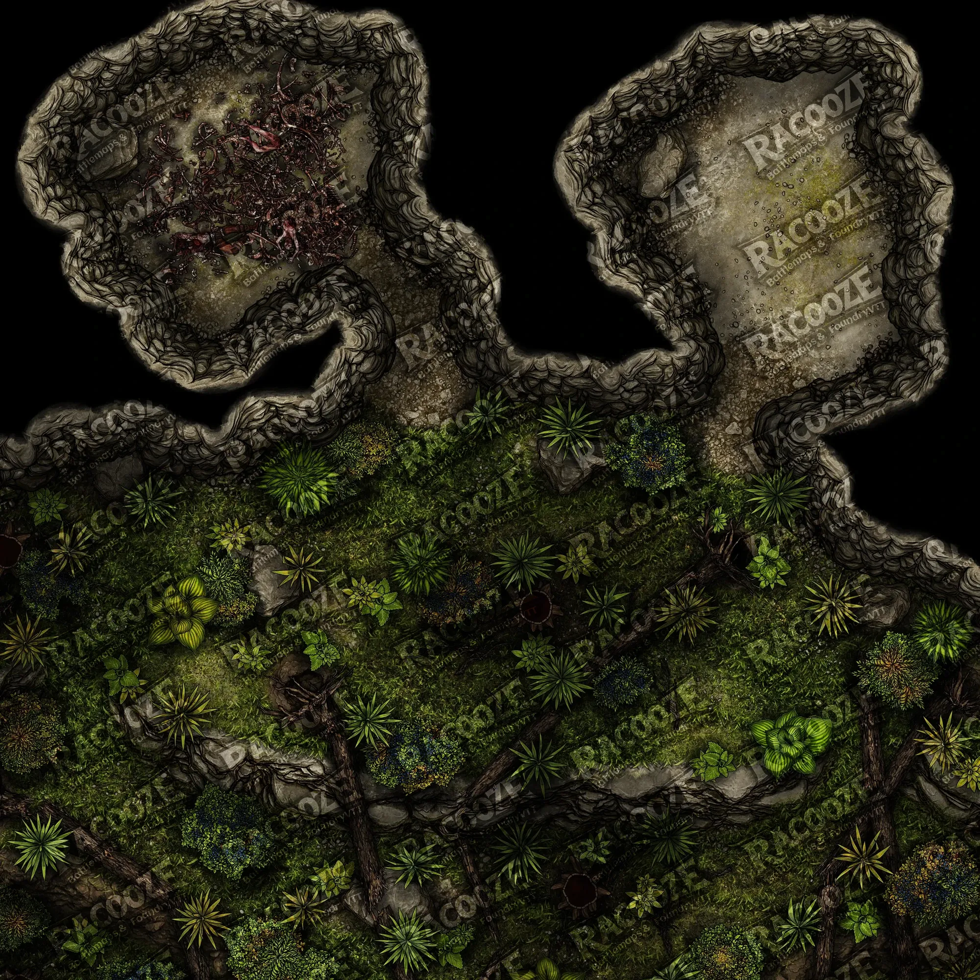 Two caves yawn open beneath the rocky rise. One, mossy and quiet, offers modest shelter: dry stone, scattered fire remains, and signs that others once rested here — briefly. The other? A darker mouth, lined with broken bones and the twisted remains of prey. Blood stains the rocks, and the foul stench of predator lingers in the air like a threat unspoken.