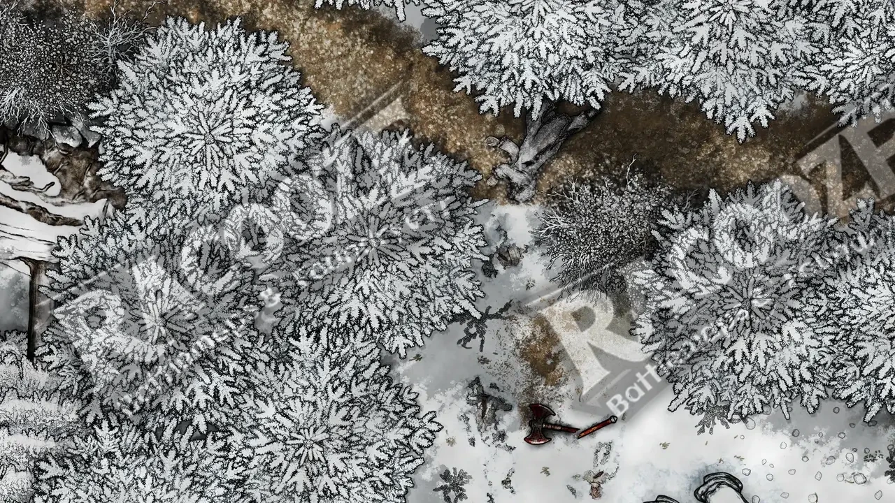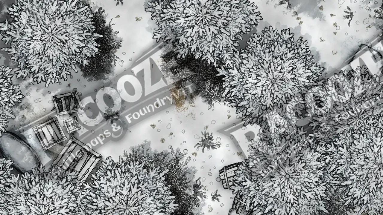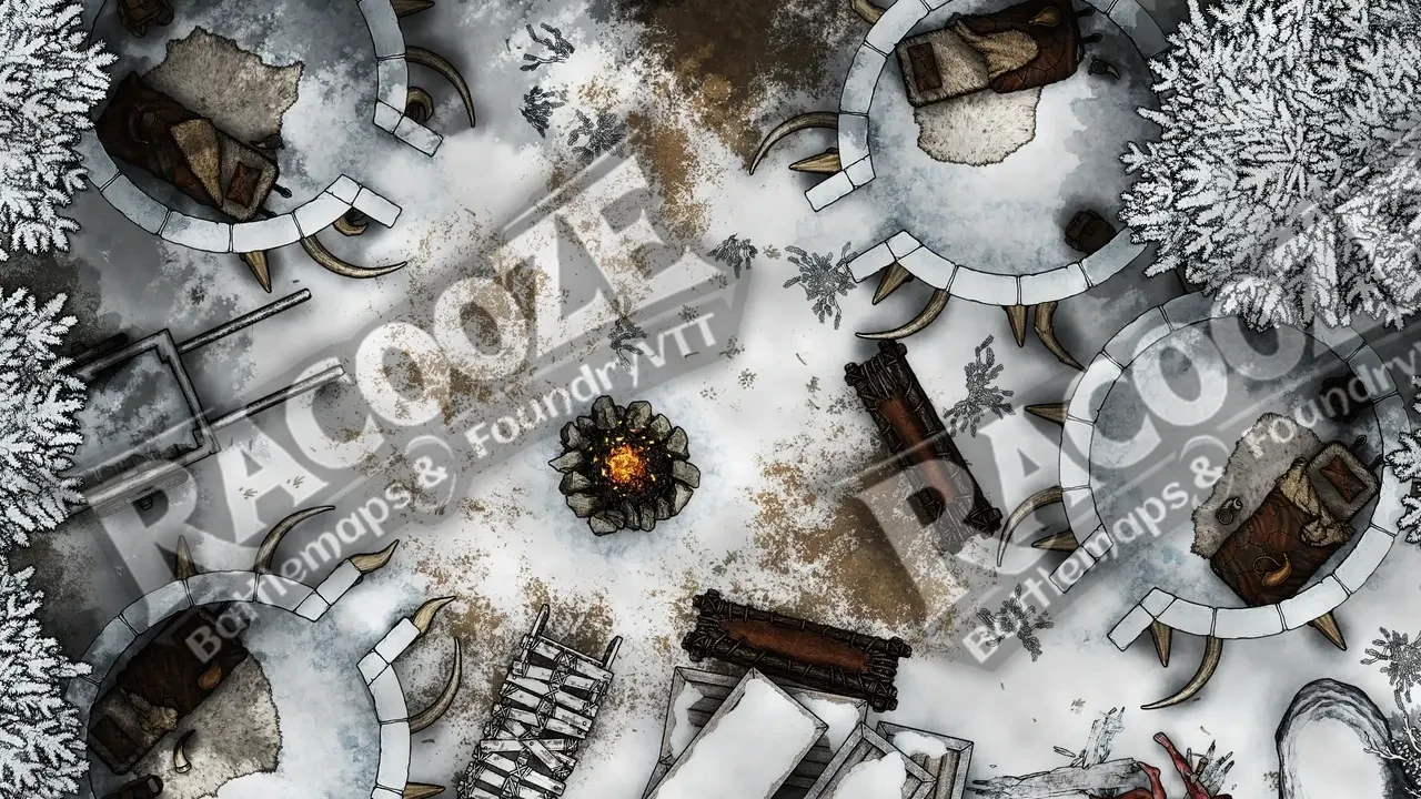 Hudenholt Forest lies buried beneath a heavy shroud of snow, the kind that swallows sound and memory alike. Between the frostbitten trees and half-buried ruins, a crude camp clings to survival — igloos built from packed snow and the tusks of beasts long dead. Smoke rises weakly from a dying fire, and dark stains mark where the snow froze red.
