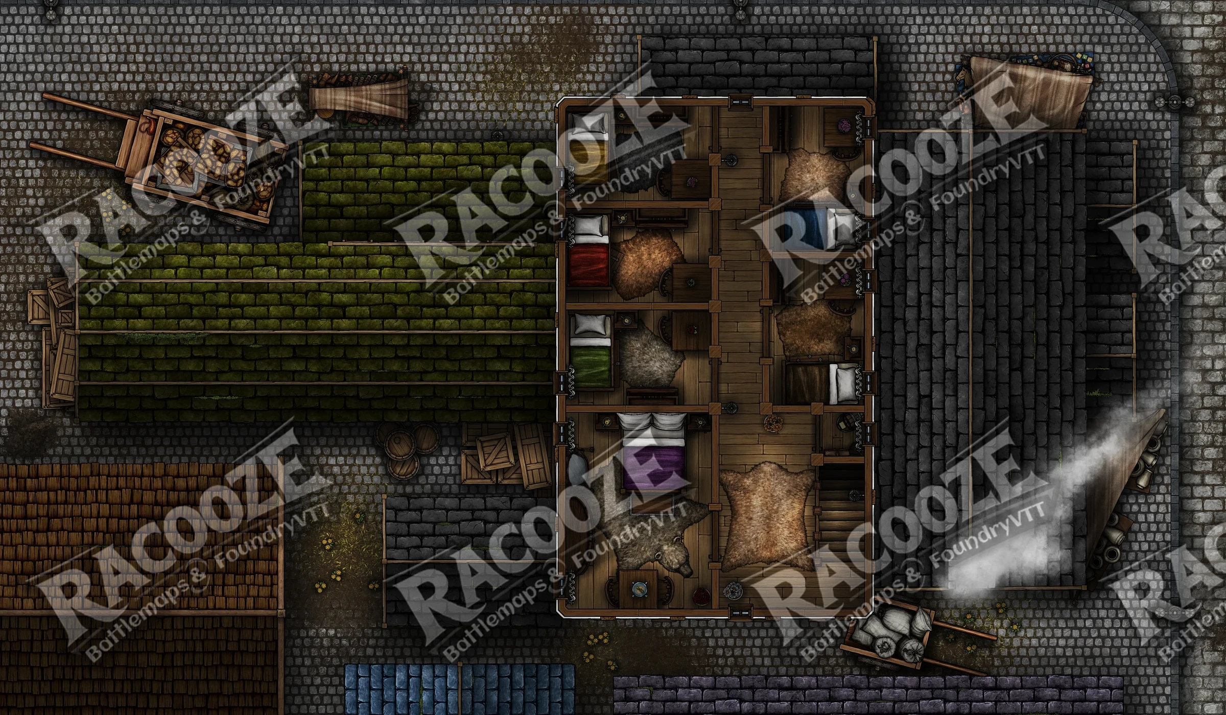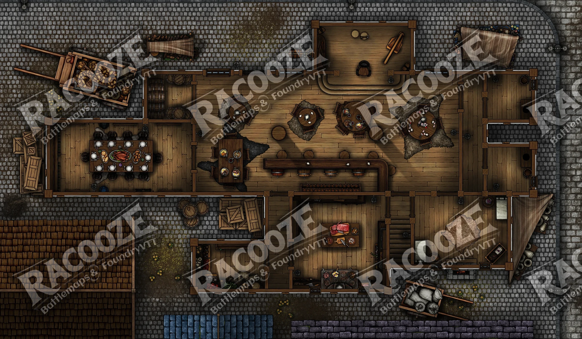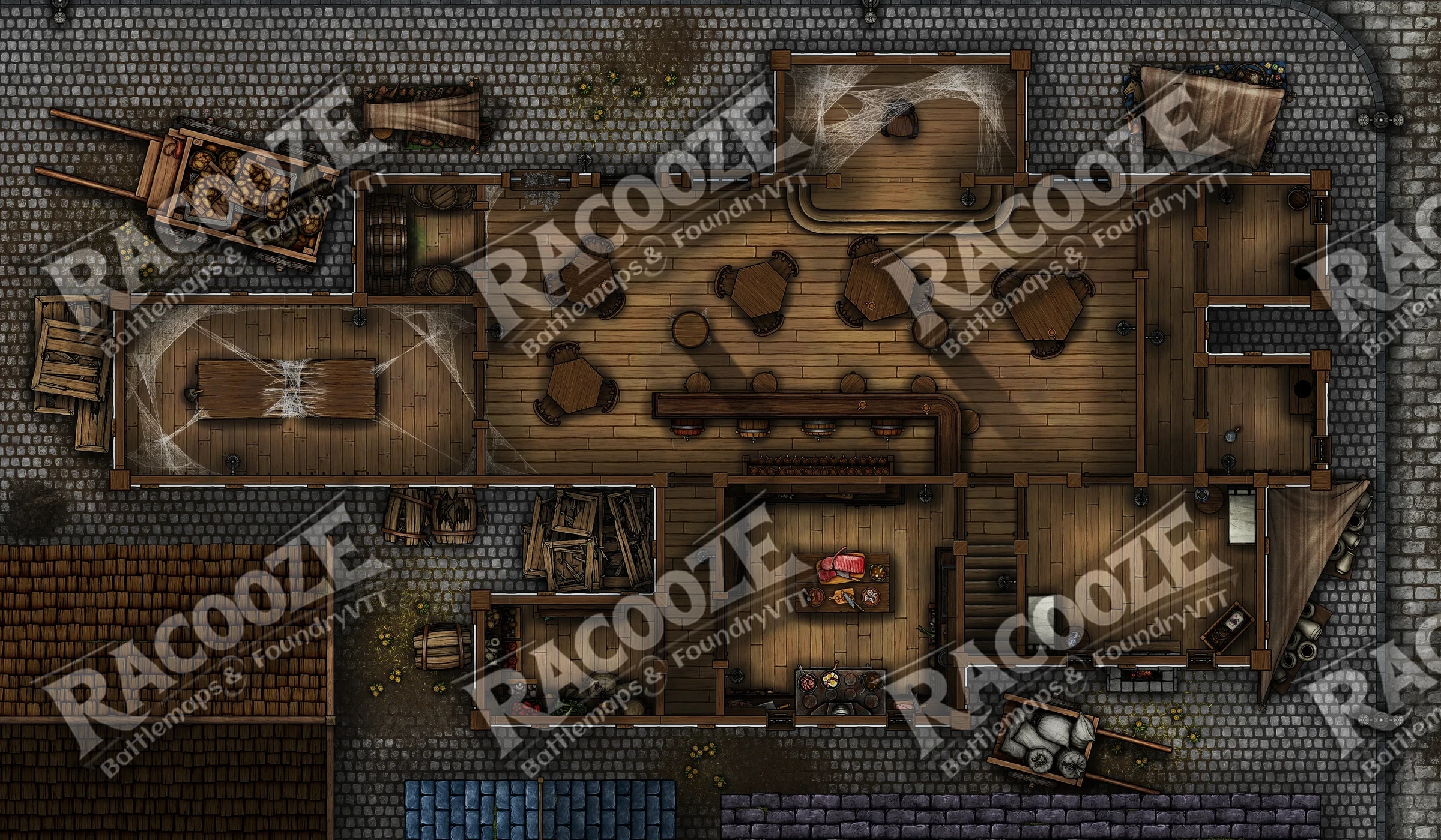 The ground floor hums with life: heavy tables scarred by knives, a bar sticky with stories, and the smell of smoke, sweat, and roast meat. Upstairs, narrow halls lead to rented rooms where dreams die cheap.