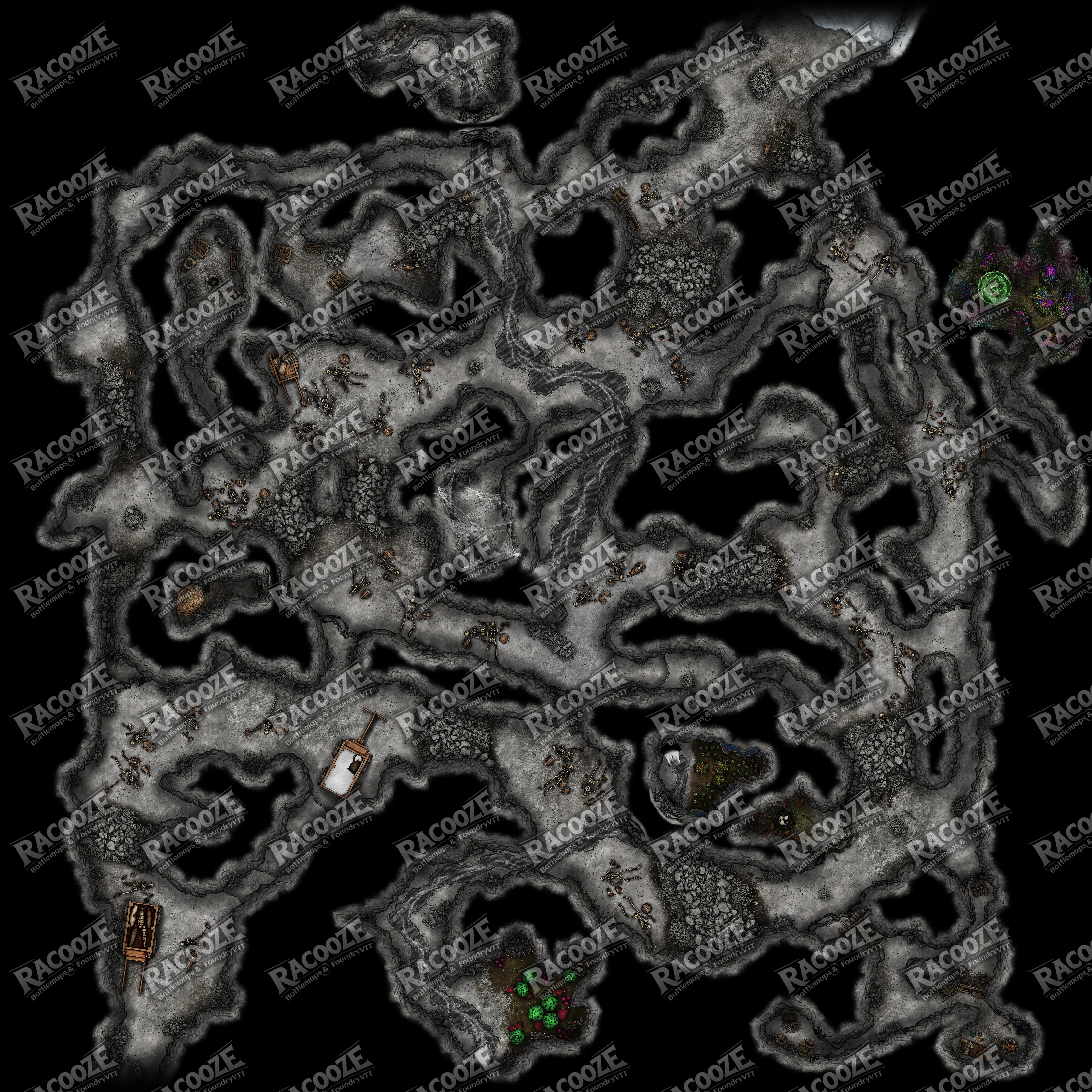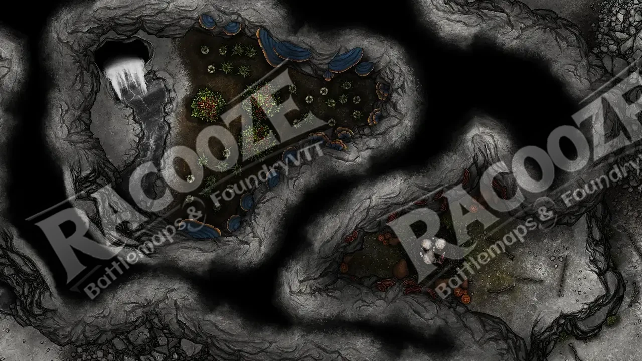 Toward the farthest reaches of the cave, the stone softens into something unnatural — glowing moss, strange flora, and a faint, melodic hum that vibrates through the air. Here, the veil between worlds has thinned. The twisted roots and luminous growths mark a passage, a one-way breach from the First World, realm of the fey.