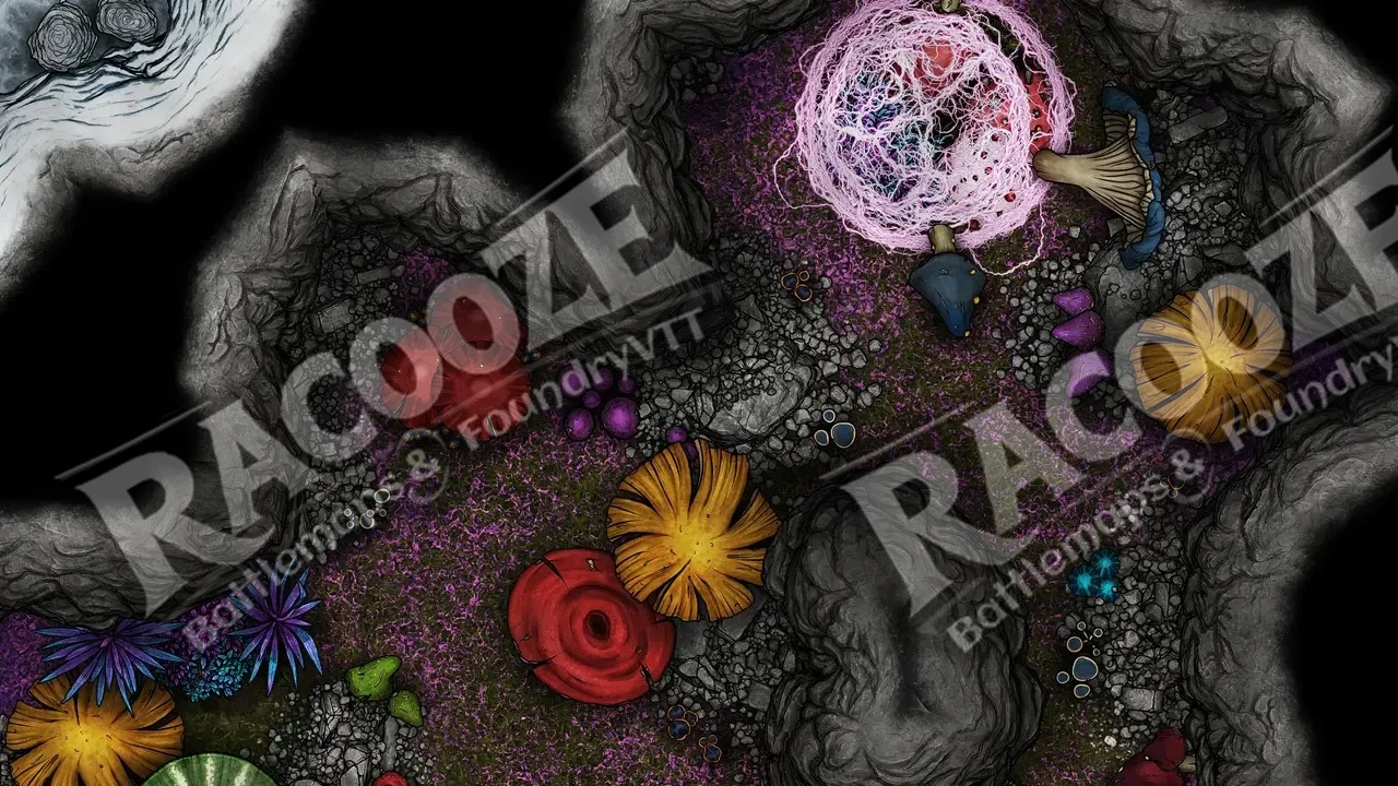 Between these two realms of contrast lies a crude goblin camp, its fires flickering nervously in the dim glow of the cavern. The goblins worship what they do not understand — building shrines to the icy rift and offering strange gifts to the fey creatures that watch from the colored mist.