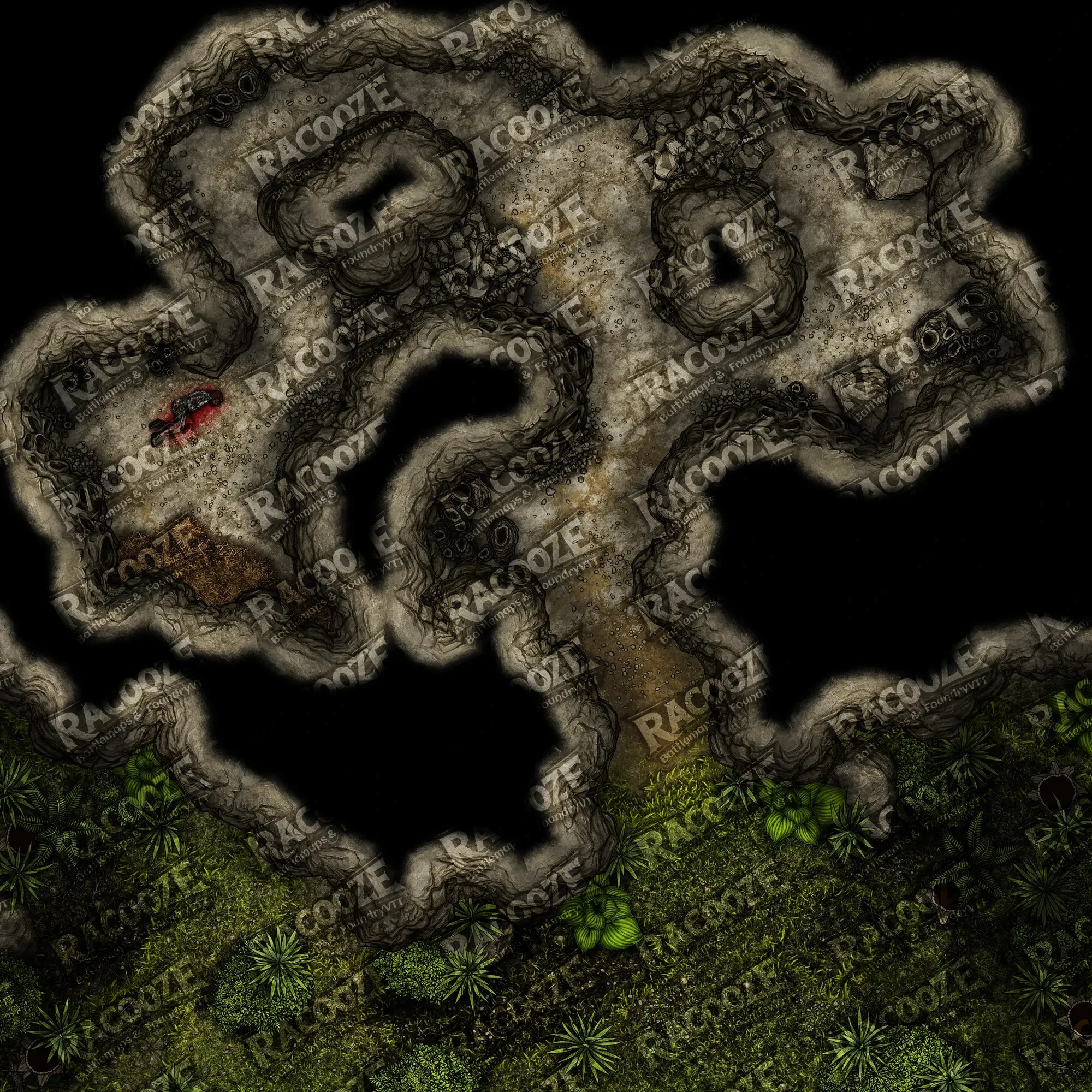 Straw and matted fur are piled in places like makeshift bedding, stained and compressed by something massive and patient. Hanging scraps of clothing, broken gear, and other remnants of past victims tell a grim story for those who dare to look closely. One such victim lies fresh, lifeless near the back wall — a silent testament to what lurks in the dark.